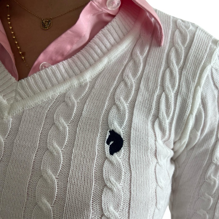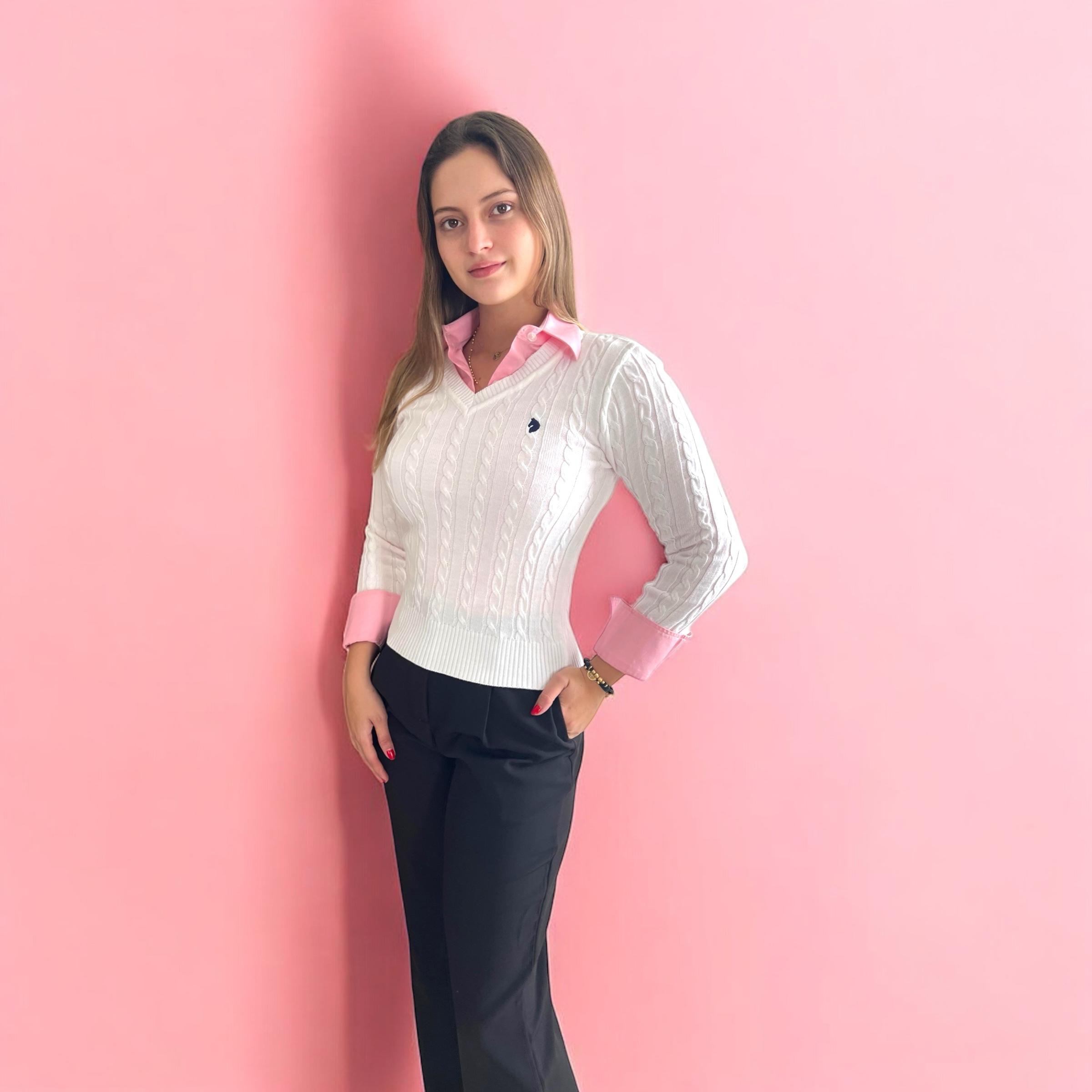 Este sweater de punto fino combina un diseño clásico con un toque moderno y femenino. Confeccionado en tejido suave y ligero, tiene un corte entallado que realza la figura y un delicado color rosa que aporta frescura a cualquier look. El detalle de cuello en «V» y el logo bordado le dan un estilo elegante y versátil, ideal para usarlo en días frescos, ya sea en un outfit casual o en un look más arreglado. ¡Perfecto para destacar con comodidad y estilo!