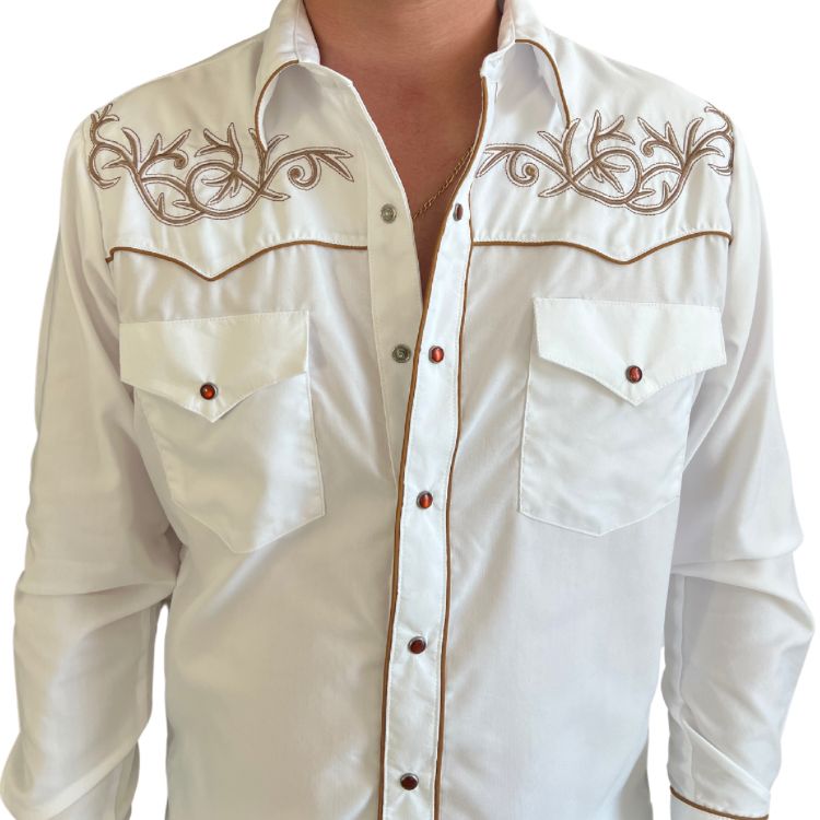 Esta elegante camisa vaquera blanca para hombre destaca por sus finos bordados en tonos marrón, que le dan un toque distintivo y sofisticado. Con detalles de piping en contraste, botones a presión con acabado en tono ámbar y bolsillos frontales con solapa, es ideal para quienes buscan un estilo auténtico y refinado. En la parte trasera, luce un impresionante bordado con un cráneo de toro y diseños florales, reflejando la esencia del estilo western. Perfecta para combinar con jeans y botas, esta prenda es un imprescindible para los amantes de la moda vaquera.