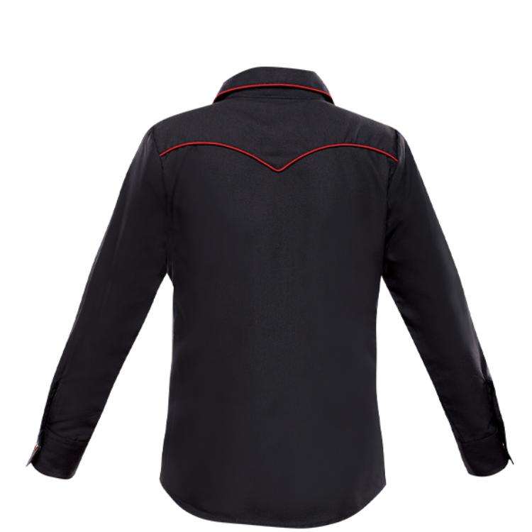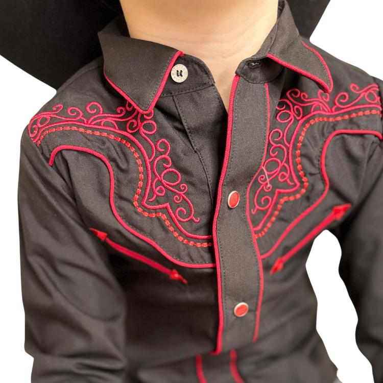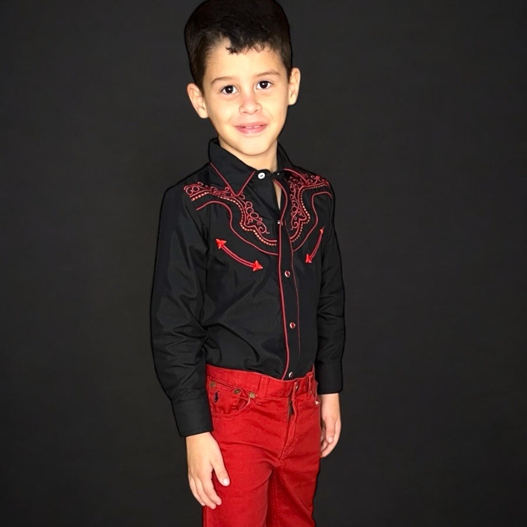 Camisa vaquera para niño en color negro con detalles en rojo, ideal para un look vaquero auténtico y llamativo. Confeccionada en tela resistente y cómoda, presenta elegantes contrastes en el cuello, puños y bordados que realzan su diseño clásico. Su ajuste perfecto y su estilo versátil la hacen ideal para cualquier ocasión, desde eventos especiales hasta el día a día. ¡Un básico imprescindible para los pequeños amantes del estilo cowboy!
