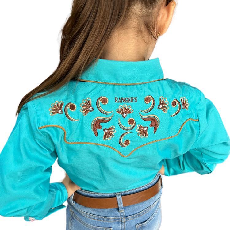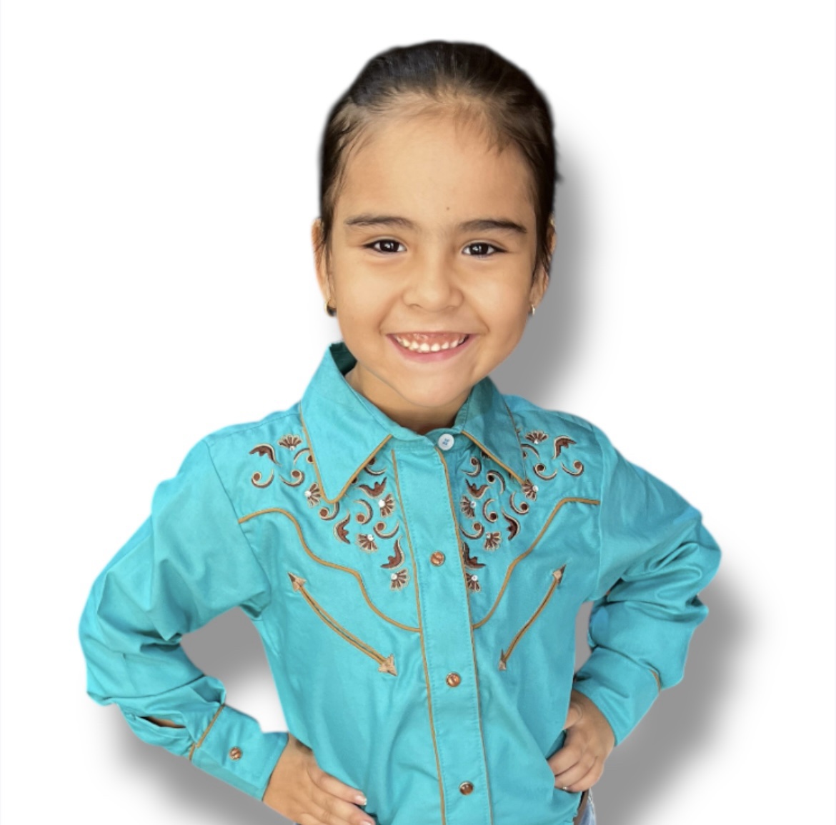 Camisa vaquera para niña en color turquesa, con bordados en tono café que resaltan su estilo western. Diseñada con detalles de piping en contraste y botones tipo snap para un ajuste cómodo y práctico. Perfecta para cualquier ocasión, se puede combinar con short, falda o jeans para un look casual o completamente vaquero