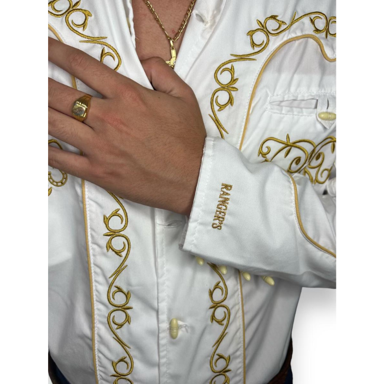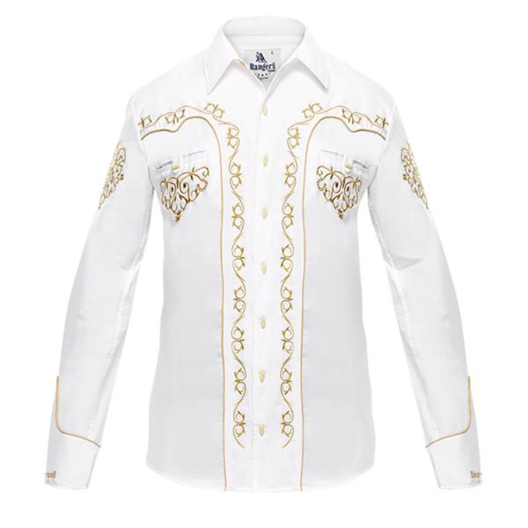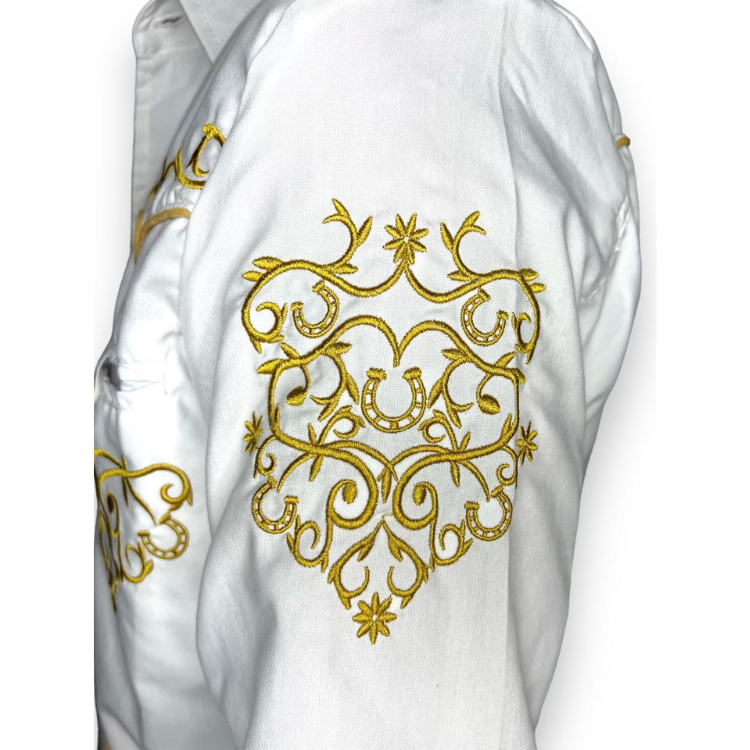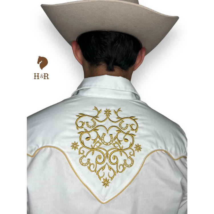 Imponente y elegante, esta camisa charra para hombre en color sólido destaca por sus finos bordados en tono dorado con diseños de herraduras, símbolo de buena suerte y tradición ecuestre. Su confección en algodón y poliéster garantiza comodidad y resistencia, mientras que su corte clásico y botones aportan un ajuste perfecto.