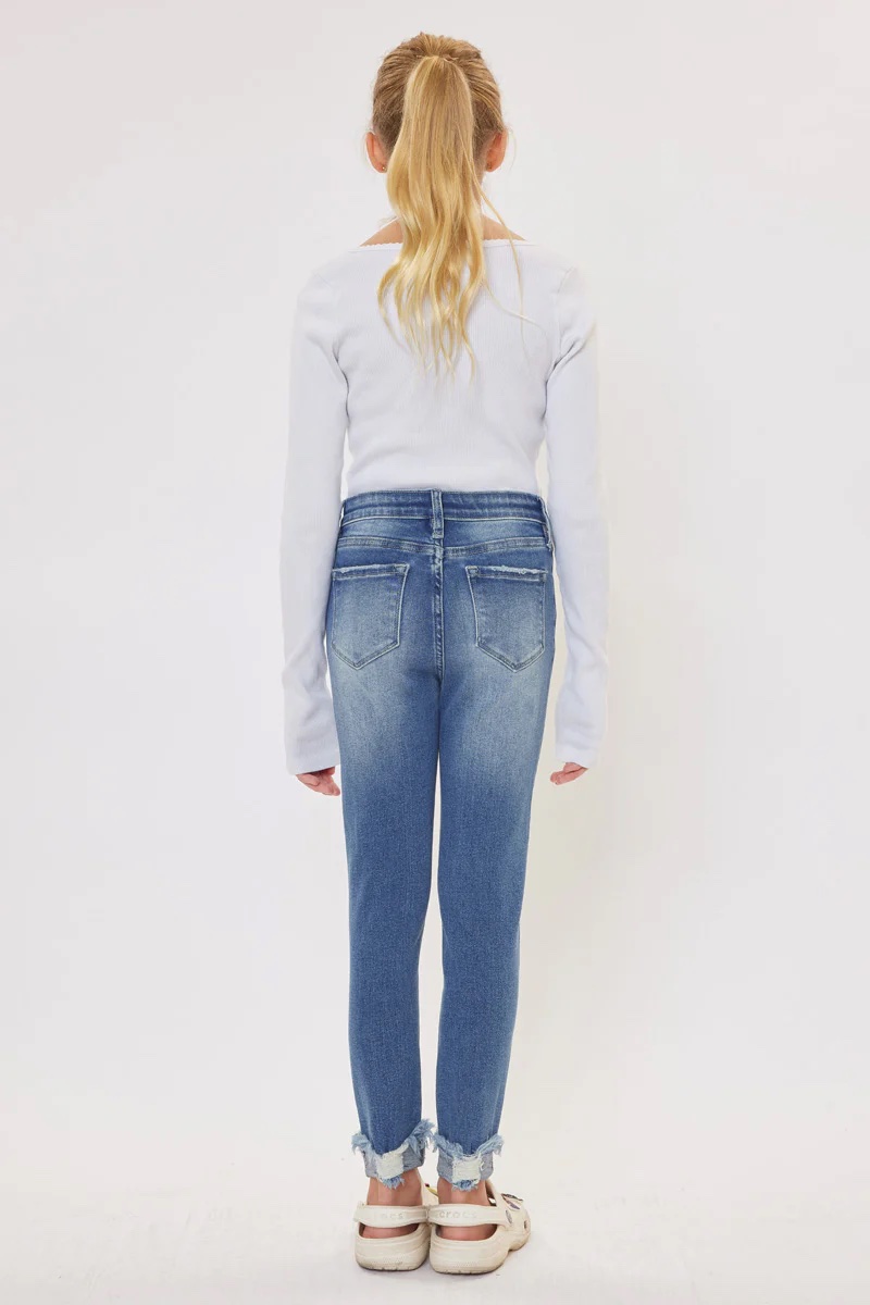 ¡Estilo con actitud desde pequeña! Nuestro pantalón High Rise Skinny roto para niña combina lo mejor de la moda vaquera con un toque urbano y atrevido.