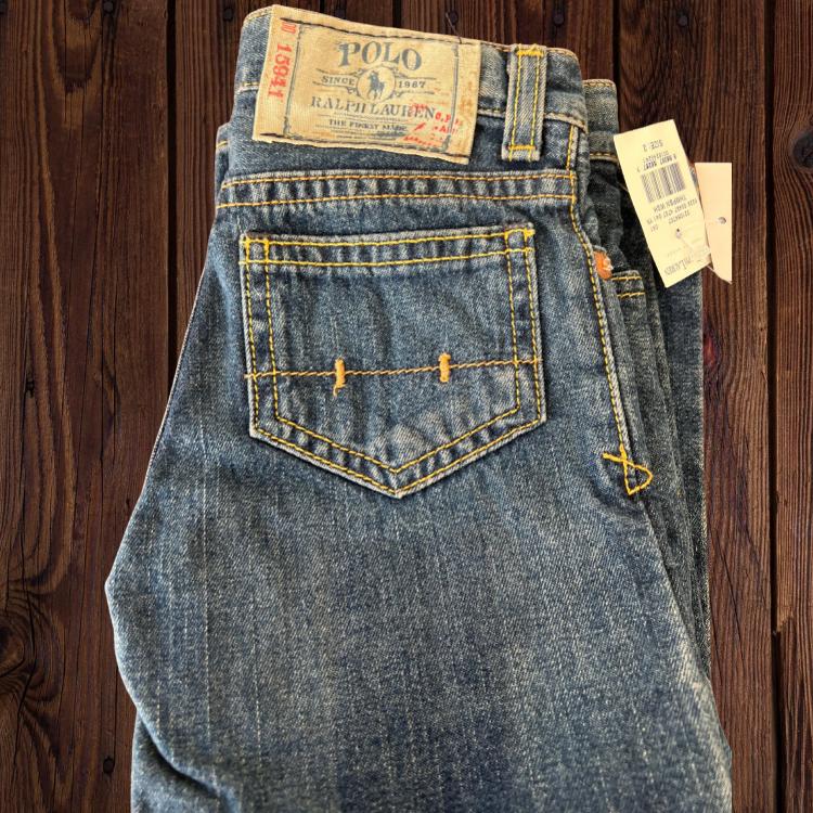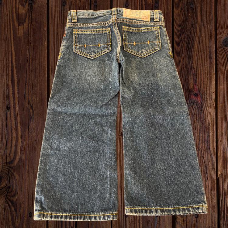 Estos jeans para niño de la marca Polo Ralph Lauren presentan un diseño clásico con un estilo vintage desgastado. Confeccionados en mezclilla de alta calidad, cuentan con costuras en contraste y bolsillos traseros con un distintivo bordado amarillo. Su corte de pierna ancha y la etiqueta retro en la parte trasera les otorgan un aire auténtico y atemporal, ideal para un look casual con un toque de estilo rústico.