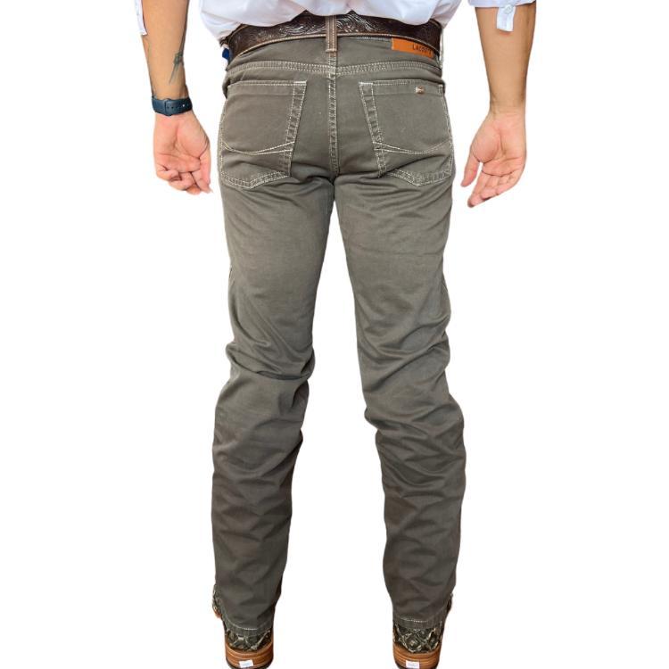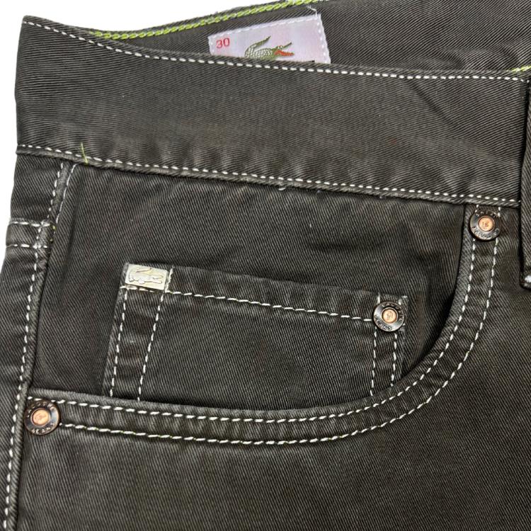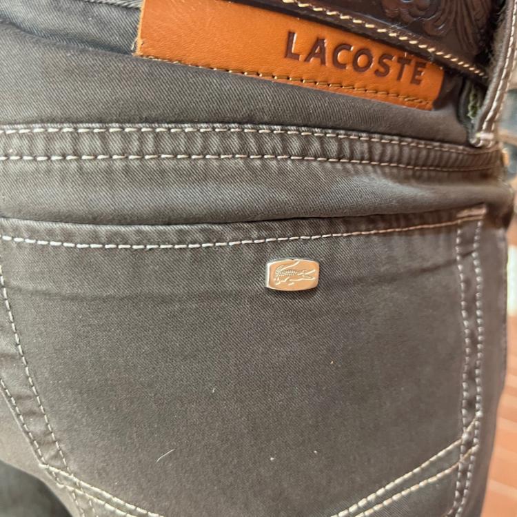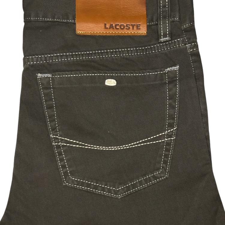 Este pantalón de la marca Lacoste es de un tono verde oscuro con costuras en contraste de color beige. Está confeccionado en un material de mezclilla o algodón de alta calidad, ofreciendo un ajuste moderno y cómodo. Presenta detalles característicos de la marca, como una placa metálica con el icónico logo del cocodrilo en el bolsillo trasero y una etiqueta de cuero con el nombre de la marca «Lacoste» en la parte posterior de la cintura.