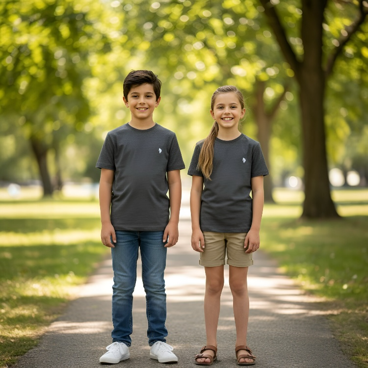 Polera infantil de cuello redondo en color gris, confeccionada en tela suave, cómoda y resistente, ideal para acompañar a los más pequeños en su día a día.