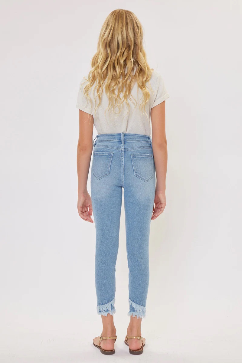 Estos jeans de tiro alto en tono celeste claro combinan un diseño fresco con detalles únicos que marcan la diferencia. Confeccionados en denim stretch suave, ofrecen máxima comodidad y libertad de movimiento para las más pequeñas. Su ruedo asimétrico con flecos y pequeña abertura frontal les da un estilo divertido y moderno.